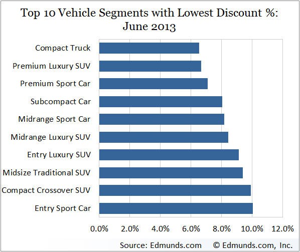 For each vehicle category displayed, the Discount Percentage by Category data is the sales-weighted average percentage difference between the MSRP and the True Market Value® of all available trim levels of that category sold in the months indicated.